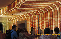 As guests arrive at Disney's Art of Animation they enter Animation Hall which is home to most of the resort's main public areas. One of the first things guests see is the check in desk area. I was with several other travel agents and one immediately commented..."I love how bright and colorful the wall is here at check in - The stripes are so cheerful". Surprised by yet another Disney vacation detail, my response to her was "Those aren't stripes, it's a PMS color chart".