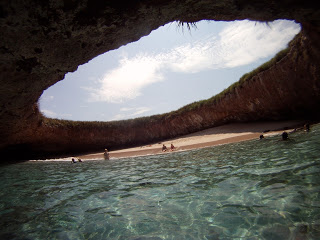 Islas Marietas pictured at the begining of this post. This cluster of islands was first discovered by Jacques Cousteau and is now a federally protected wild life preserve. This area is home to thousands of species of birds, octopus, sea turtles and tropical fish. I especially want to visit Playa Del Amor, the "beach of love". This beach is formed out of volcanic rock and is only accessible by swimming thru a cave. It's perfect for a gringo like me who cannot take too much Mexican sun because this beach has it's very own stone palapa!